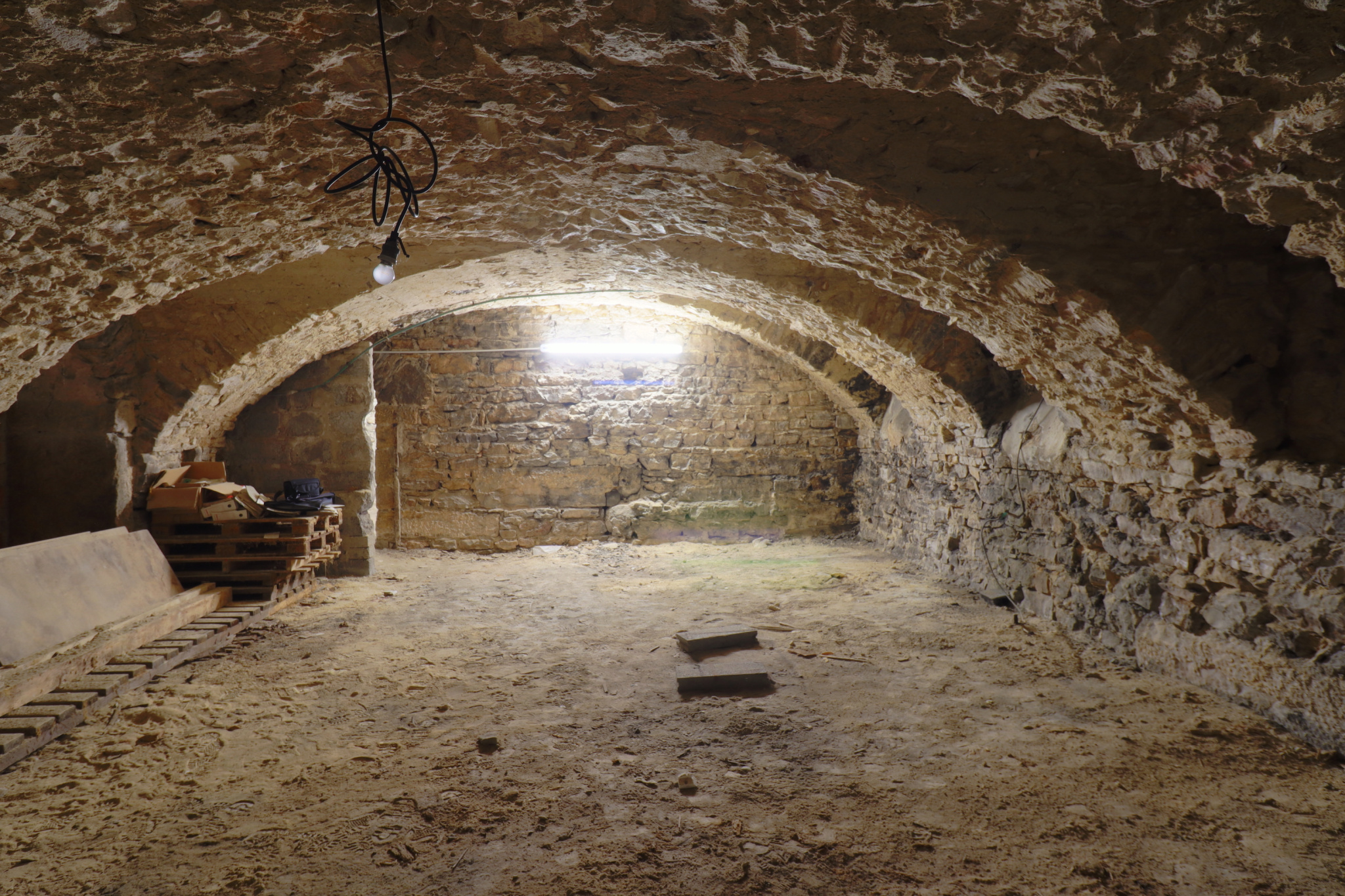 Une cave voutée en pierre de 62m2 se trouve sous le local (hsp 2,70m). Les deux peuvent être réunis pour faire un lieu de stockage, des serveurs informatiques ou recevoir du public.