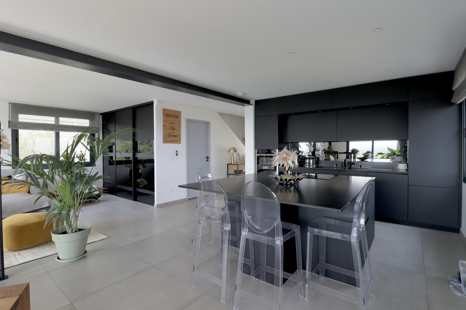 d’une cuisine ouverte moderne, conçue par Ambiance Concept, alliant esthétisme et fonctionnalité (plan de travail en pierre du Zimbabwe, rangements « push & pull »…),