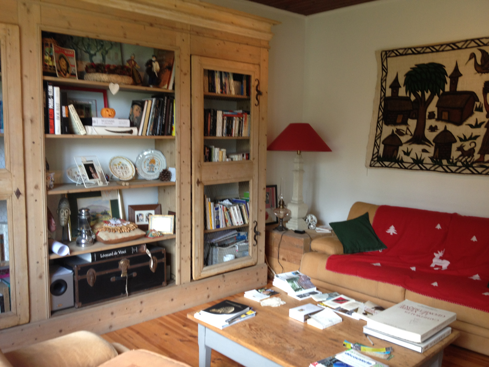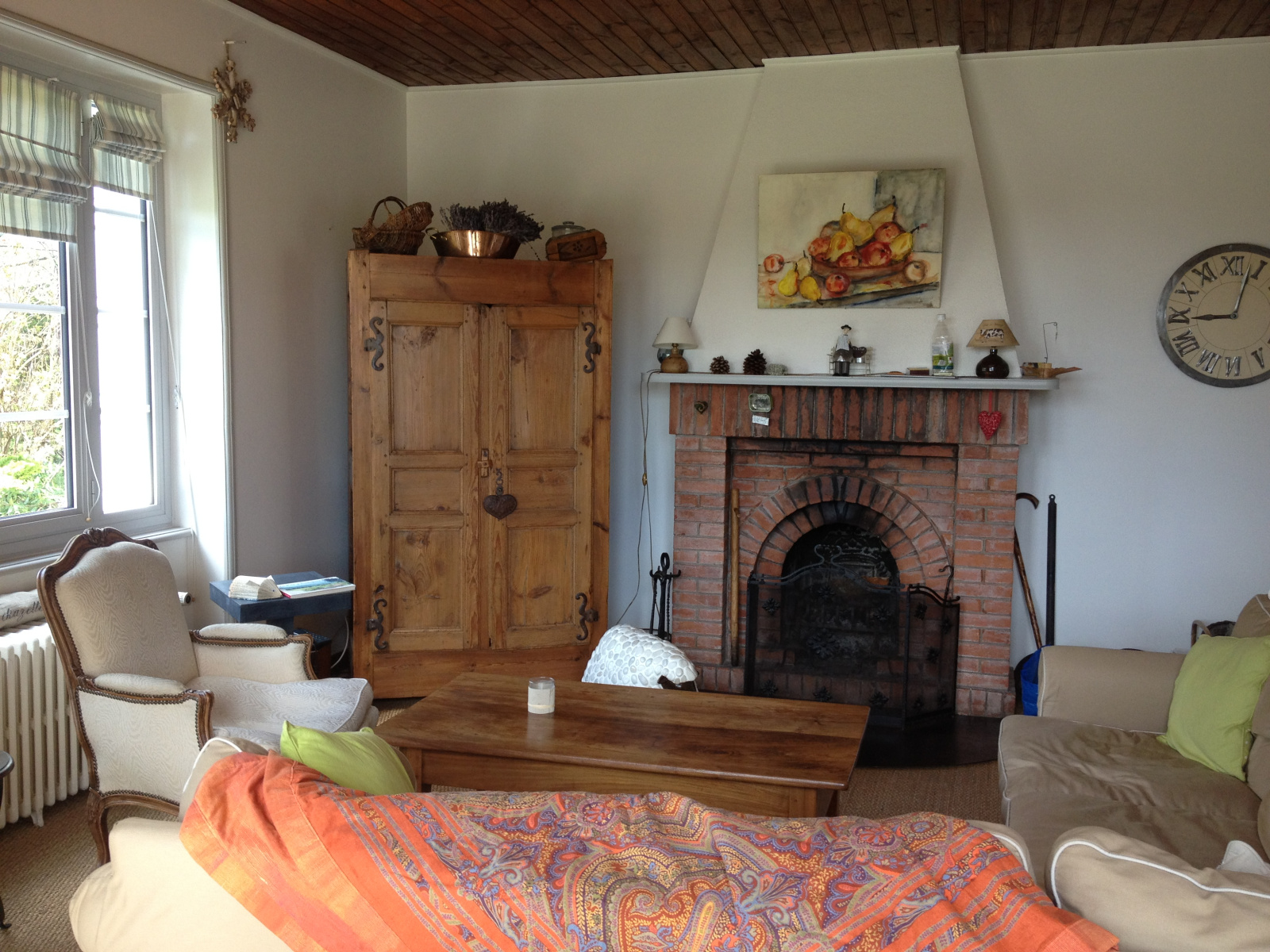 Entrée, cuisine équipée, salle à manger, salon avec cheminée, bibliothèque
