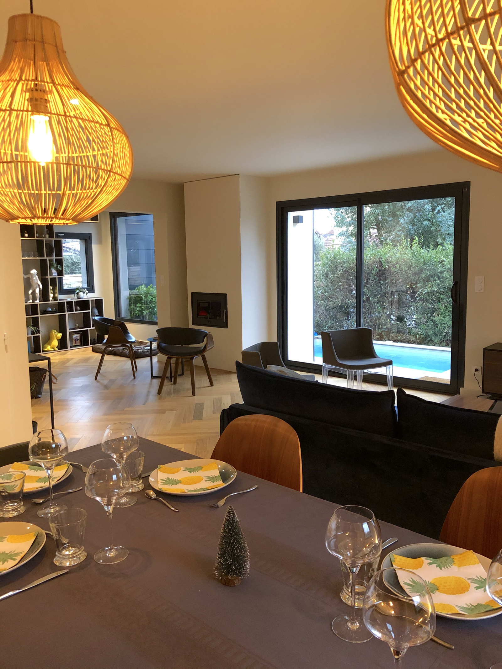 un séjour en parquets chevrons ouvrant sur le jardin avec terrasse en ipé et piscine orientée sud