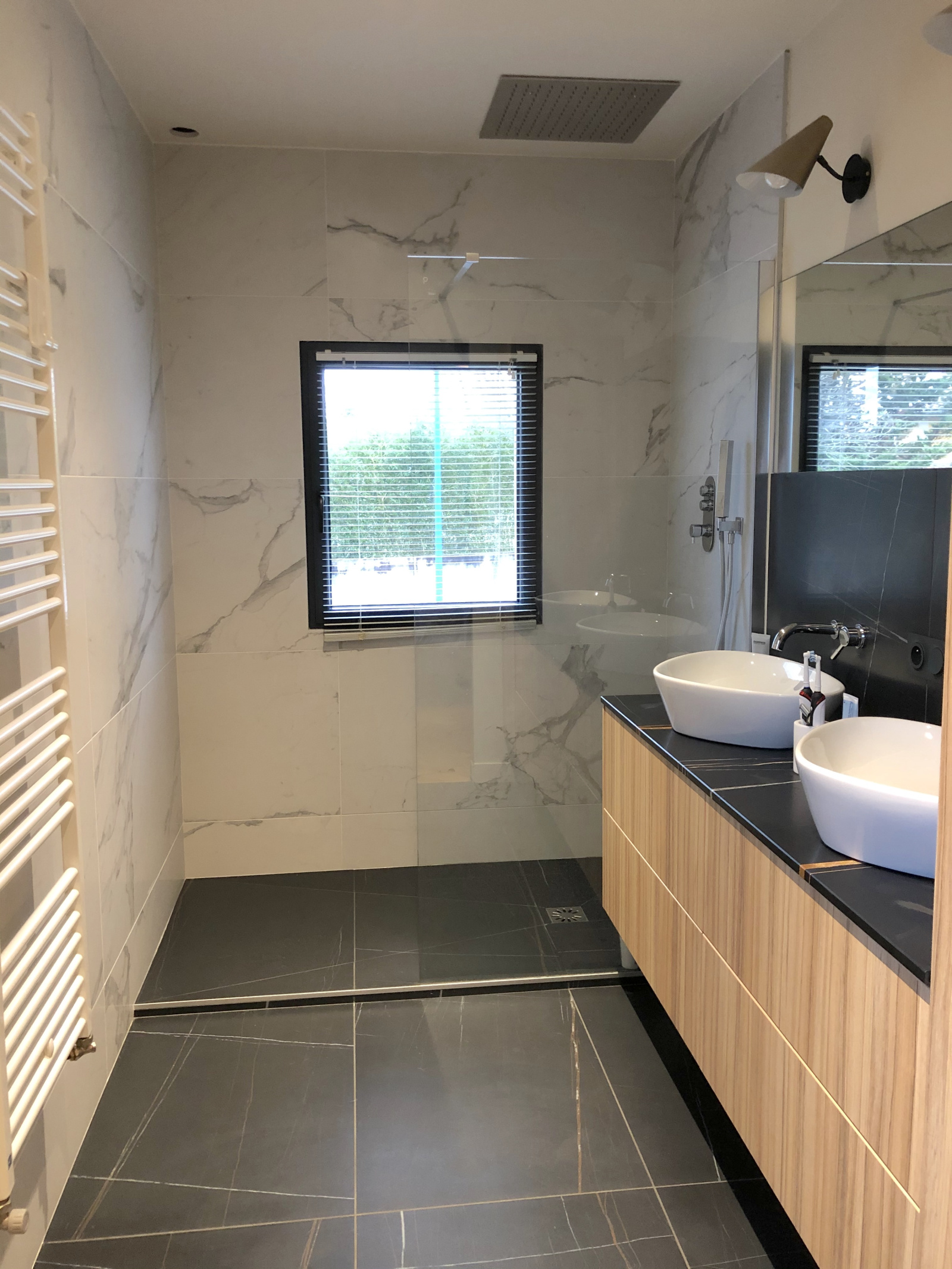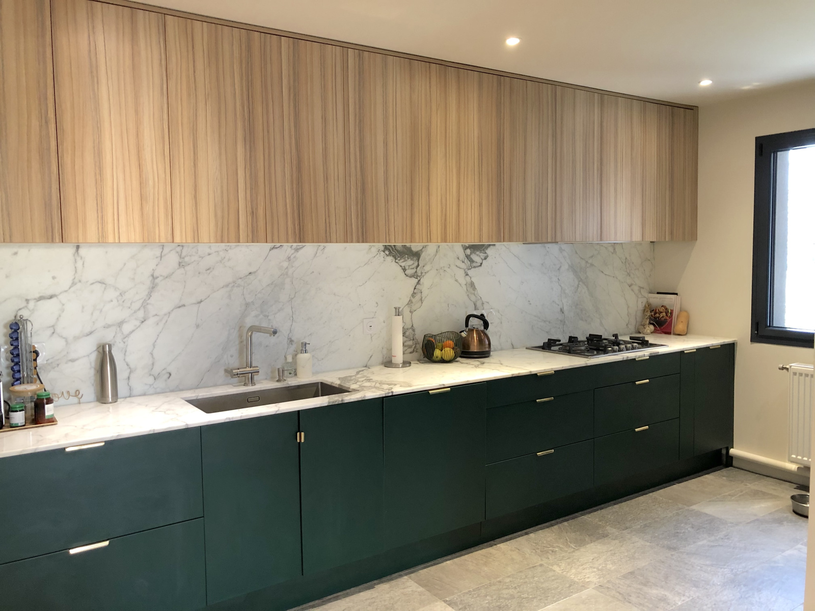 Grande cuisine ouverte avec plan de travail et crédence en marbre "livre ouvert"
