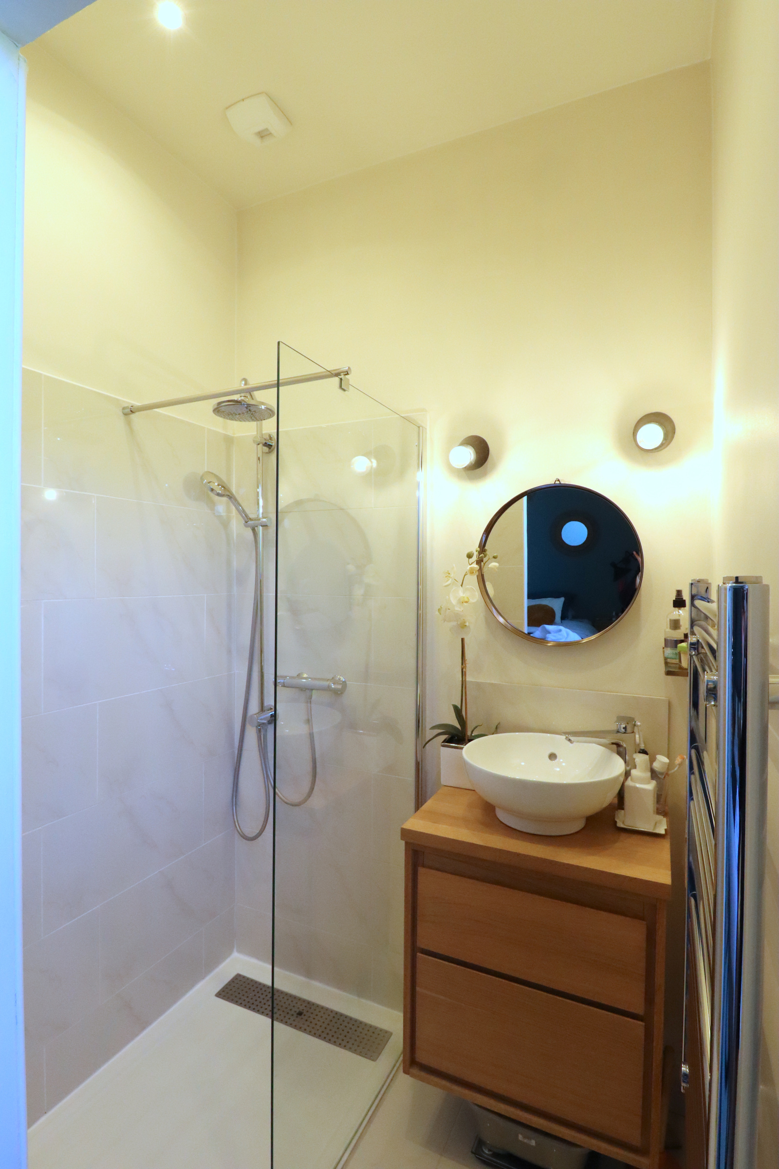 Séjour avec cuisine USA toute équipée, chambre de plain pied avec salle d'eau et dressing, toilettes, et 3 chambres à l'étage, de belle taille, soupentées, avec salle de bains et toilettes