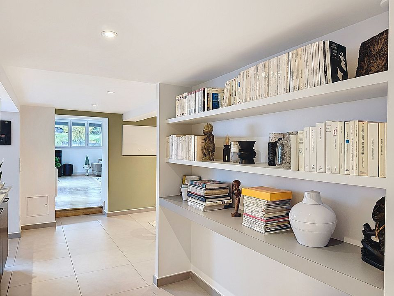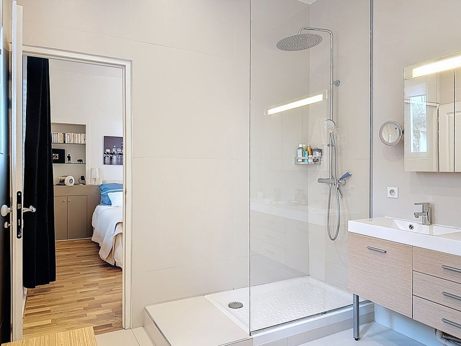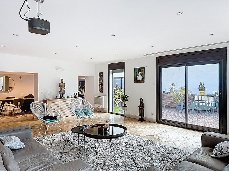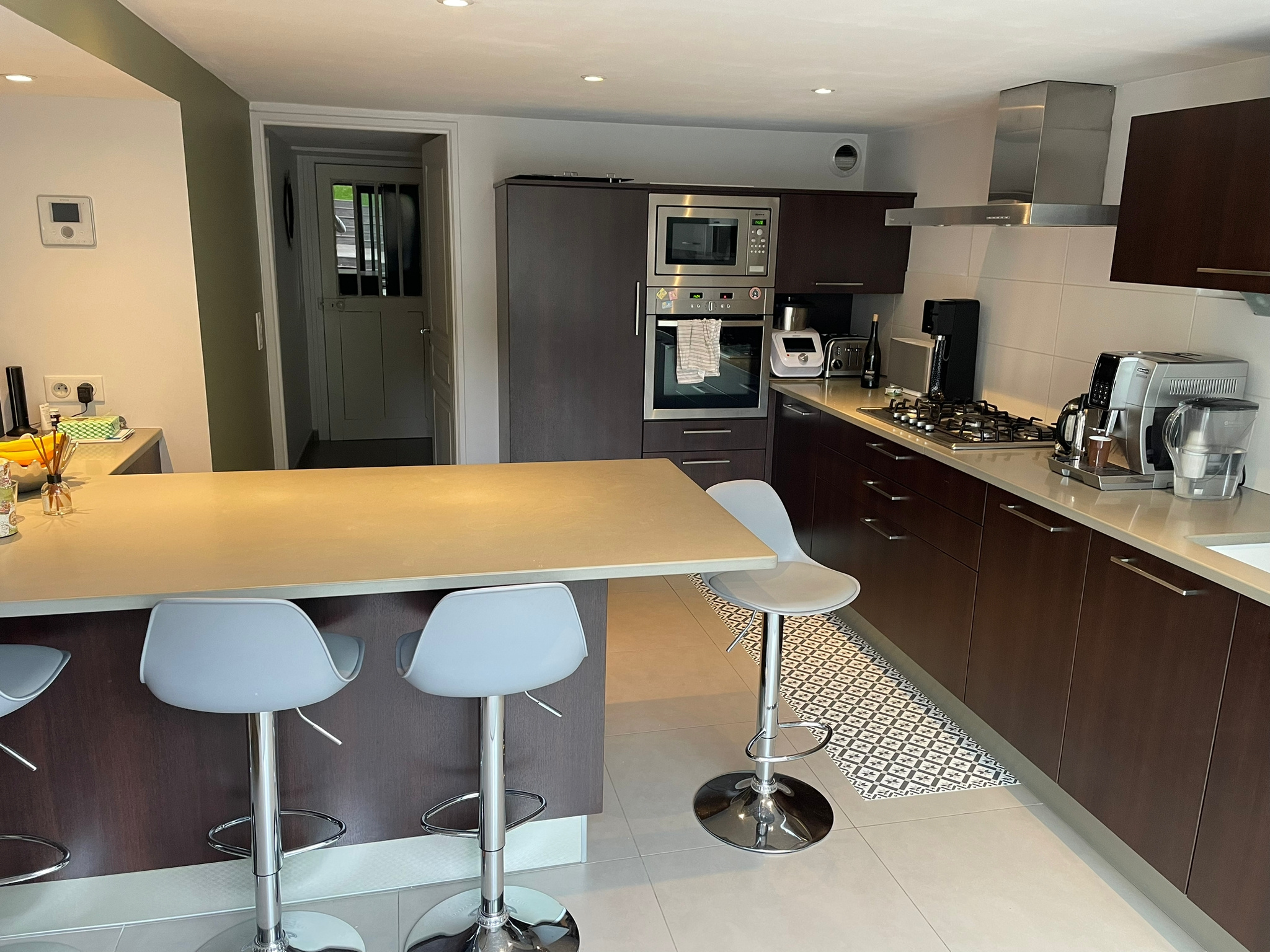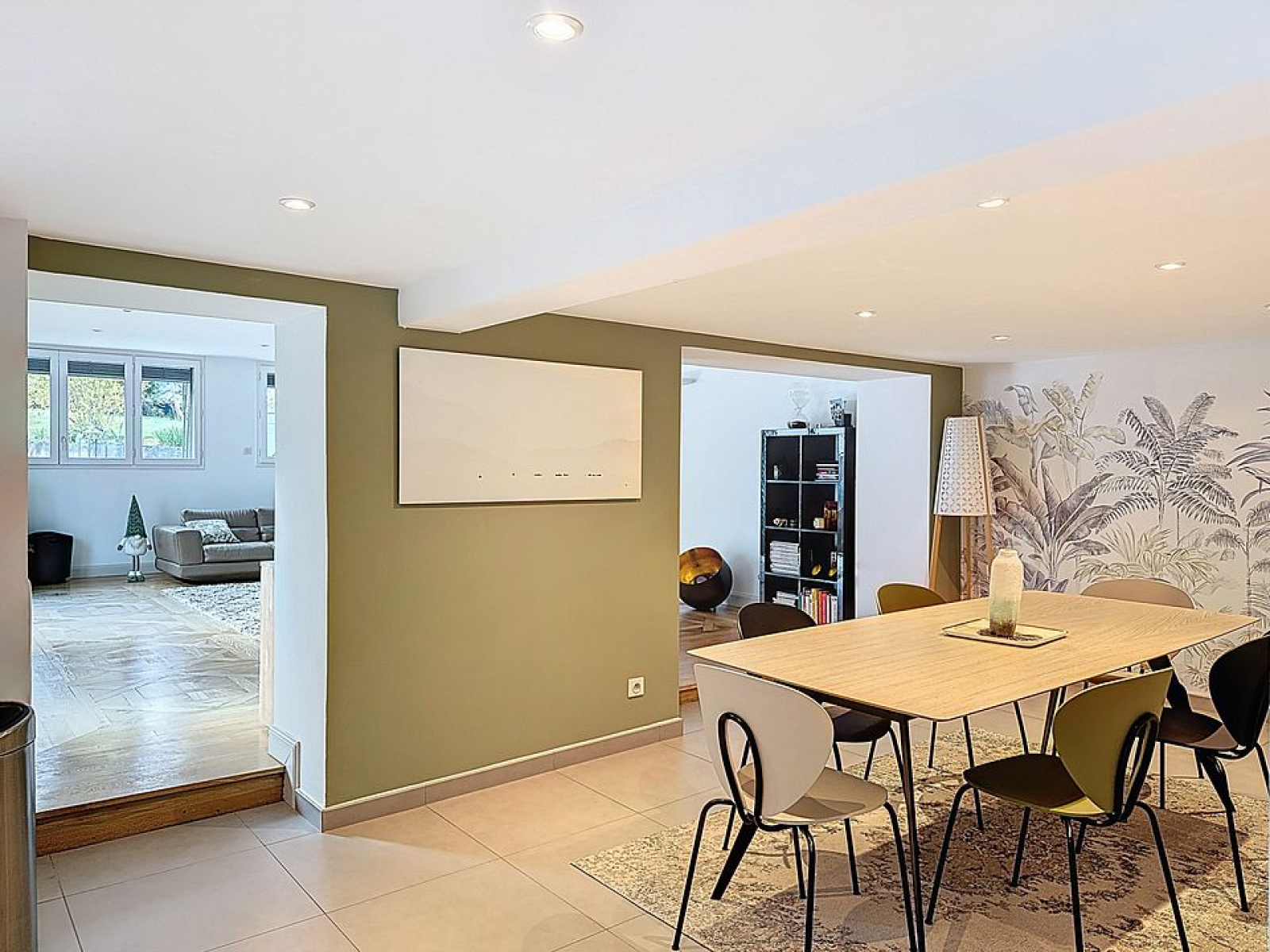 Séjour de 50 m2 avec parquets Versailles, cuisine équipée US, salle à manger intimiste, buanderie, toilettes