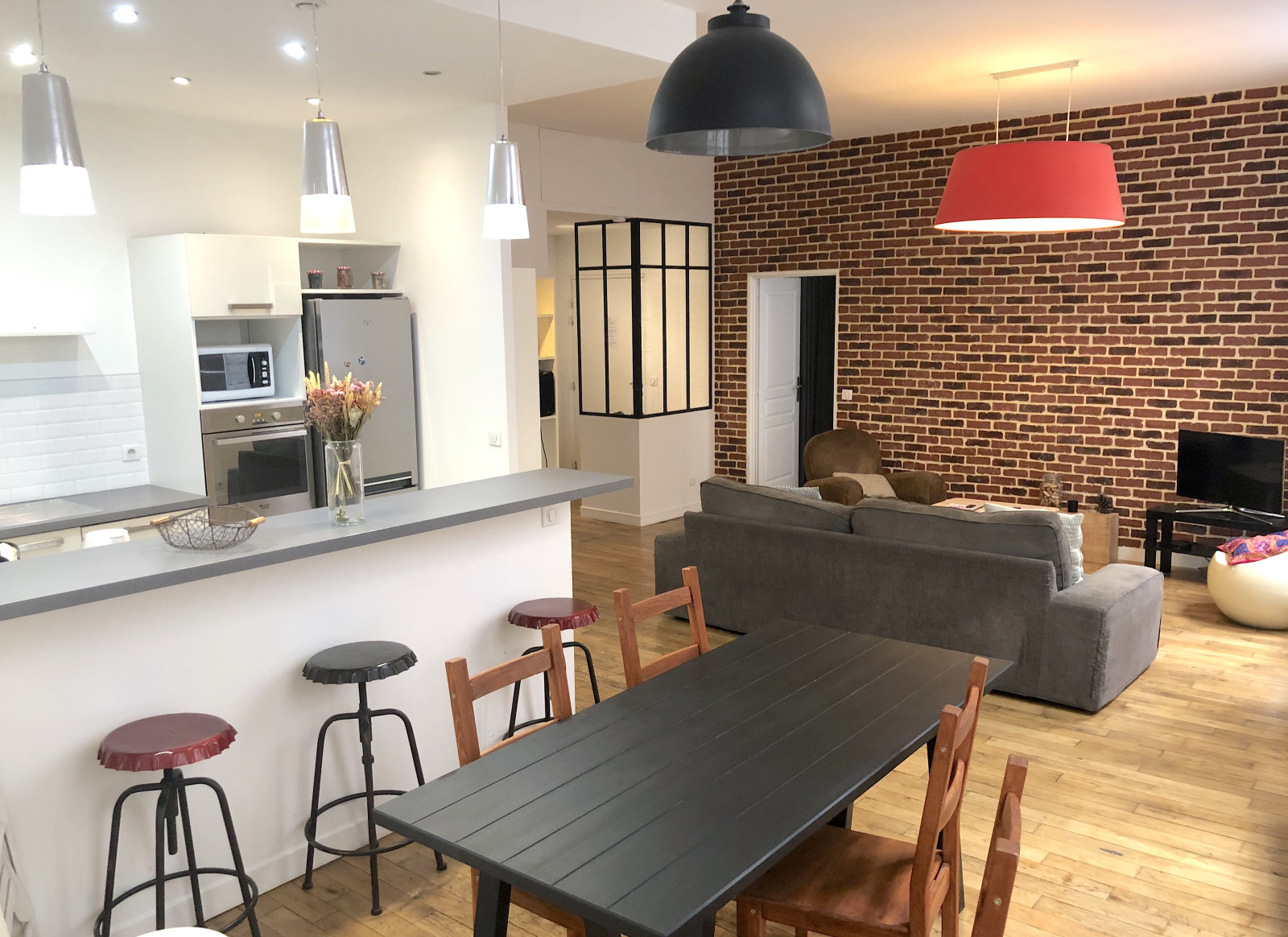 Une rénovation qui allie goût et qualité. Ce bien se compose d'une entrée séparée par une verrière, un beau séjour avec parquet ancien et mur en briques, une cuisine ouverte et équipée, une chambre avec dressing, salle de bains et wc.