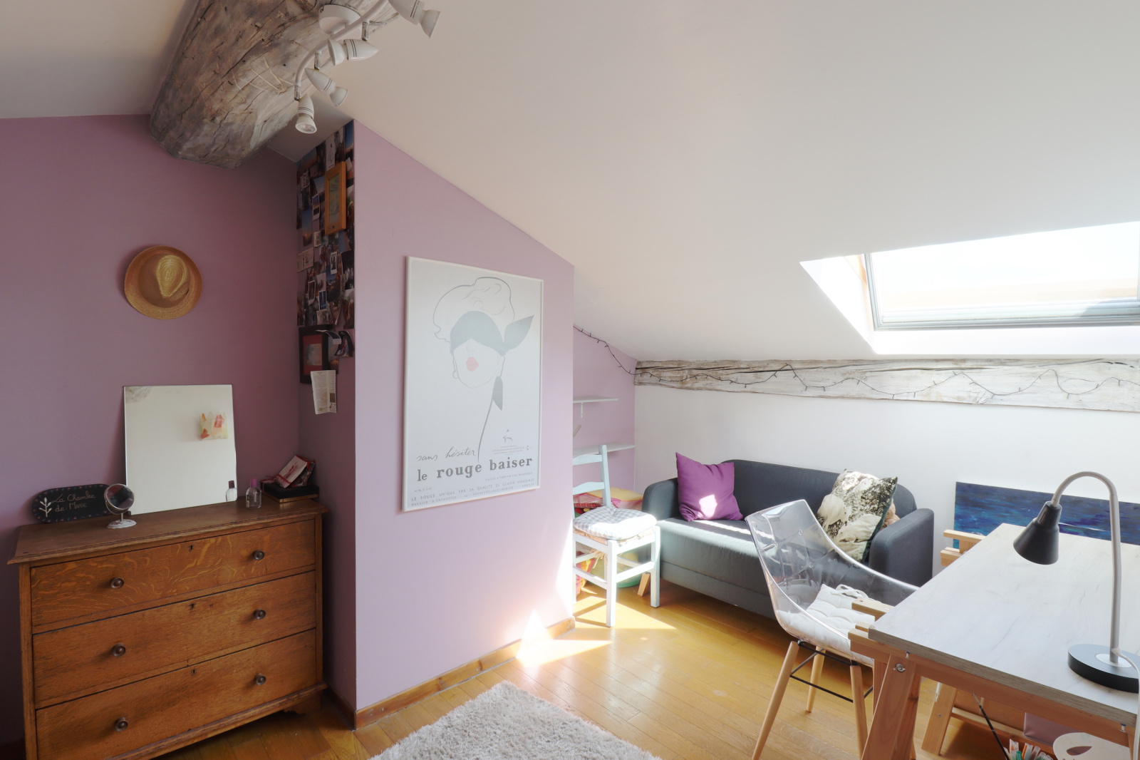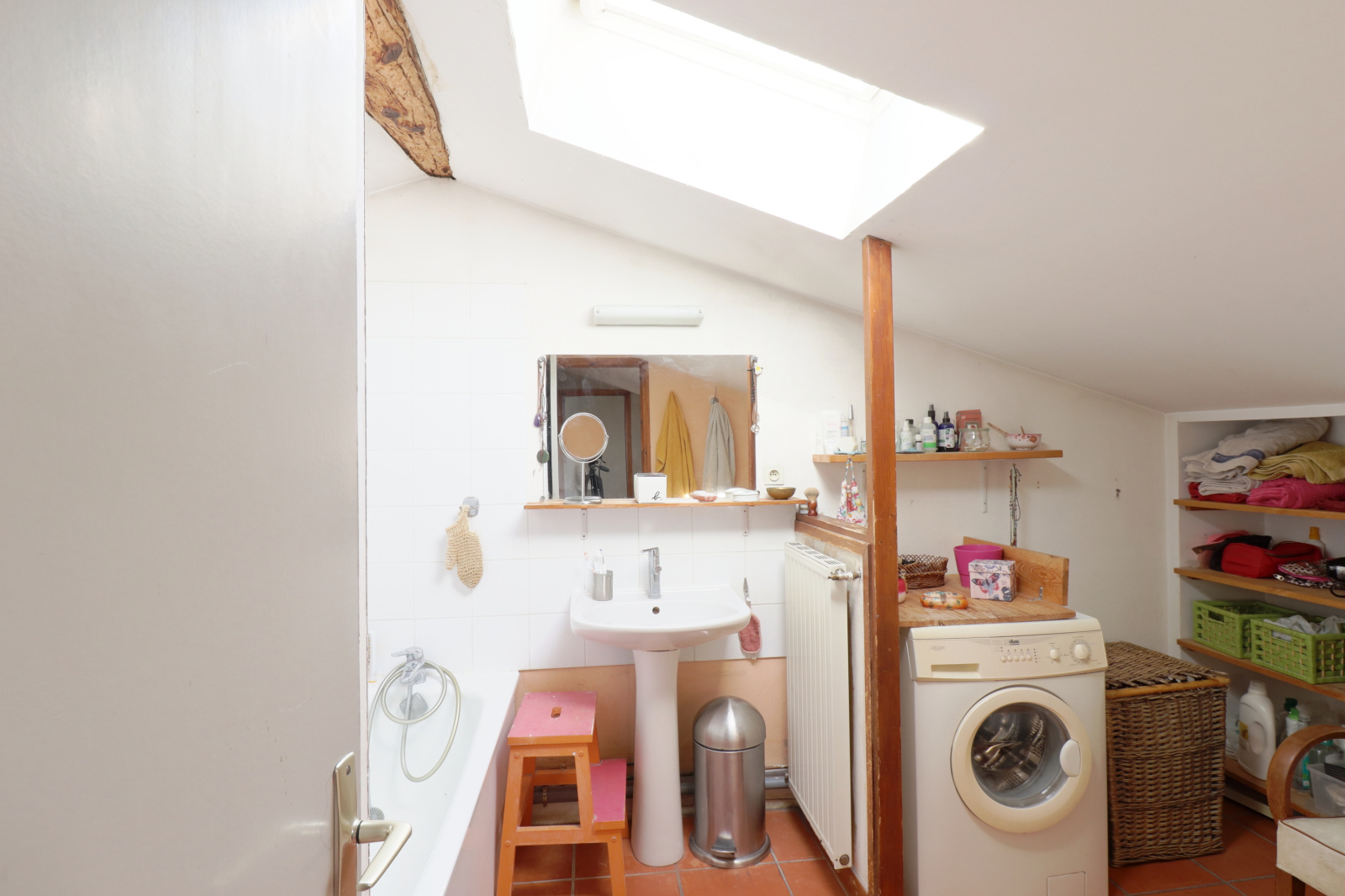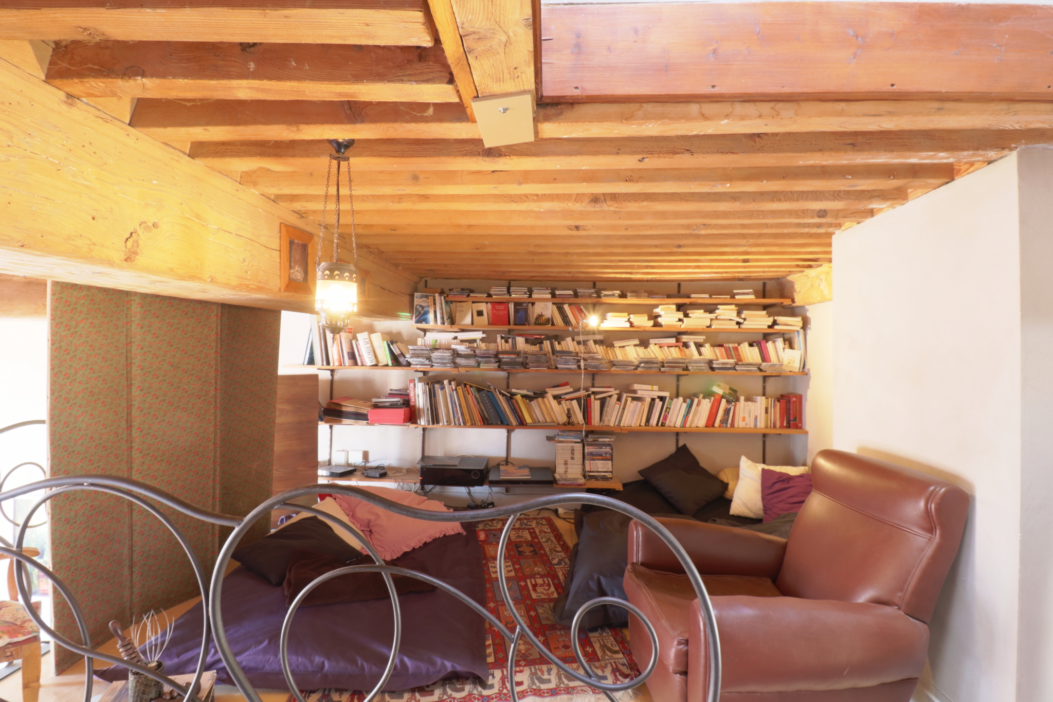Entre les chambres du premier étage et le séjour se trouve deux mezzanines. La première est un espace face aux fenêtres, pouvant être une chambre d’appoint ou un bureau. La deuxième fait actuellement office de coin bibliothèque et musique !