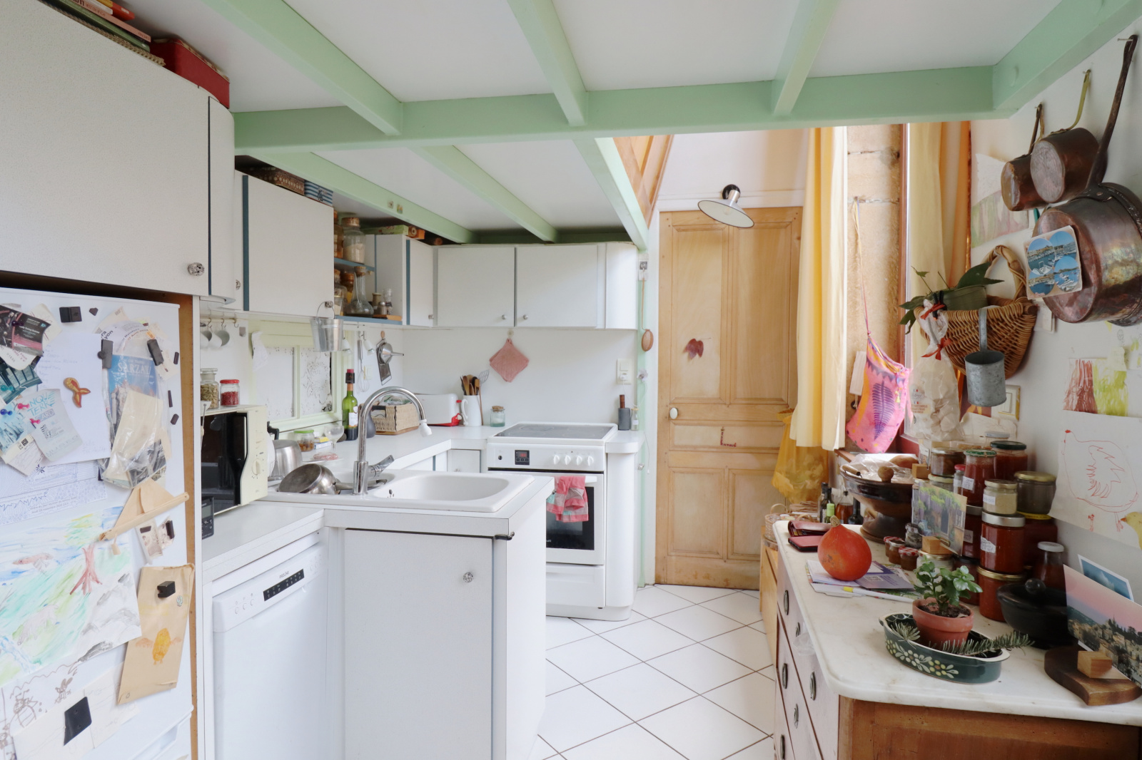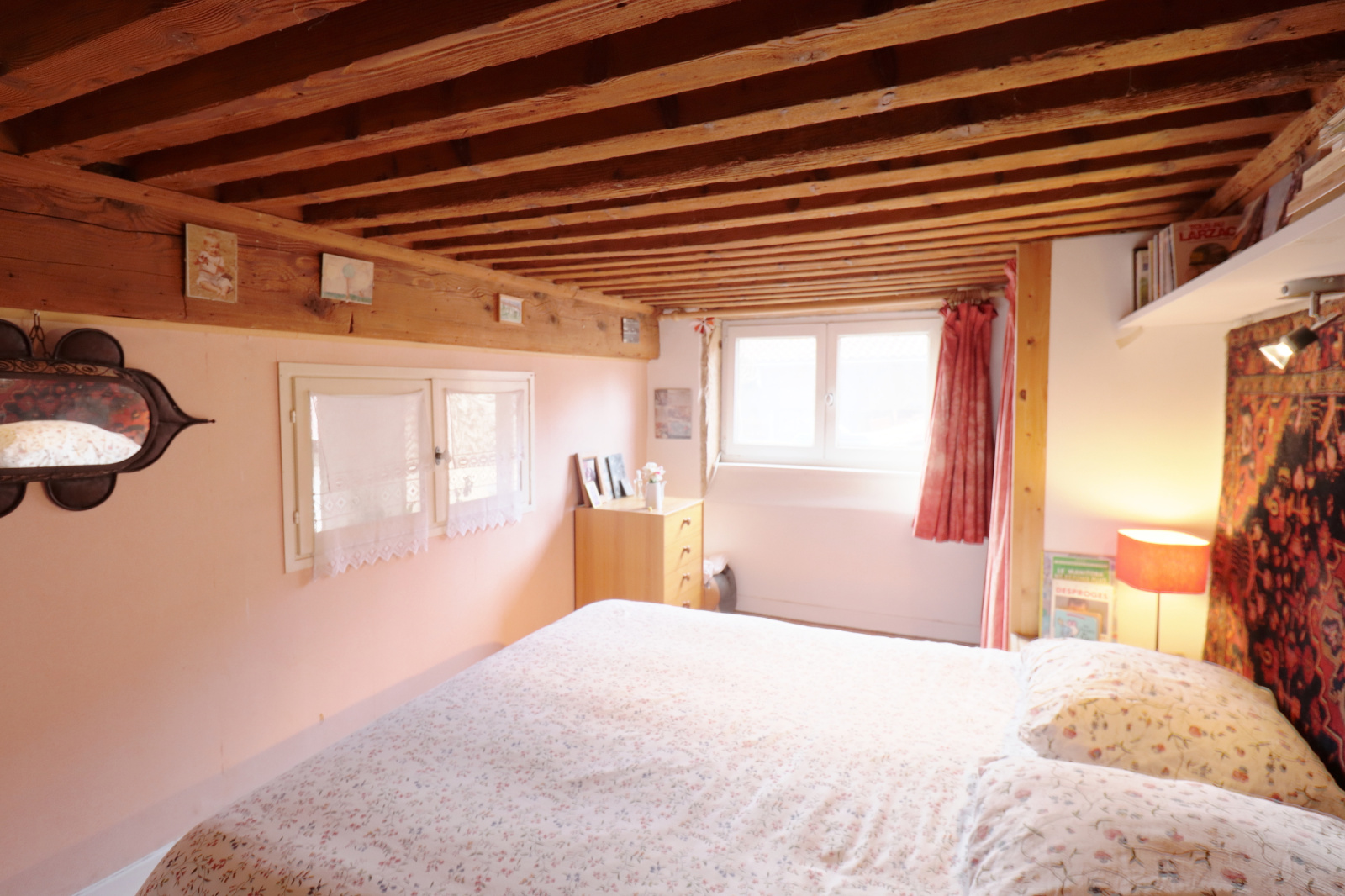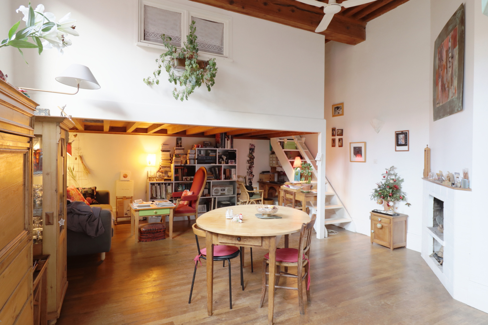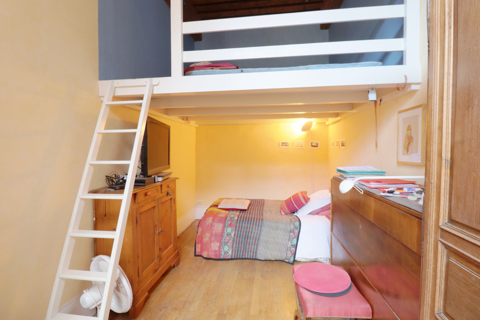 Vous pourrez profiter de deux chambres et un coin nuit / bureau / atelier donnant sur un grand séjour avec un magnifique plafond à la française.