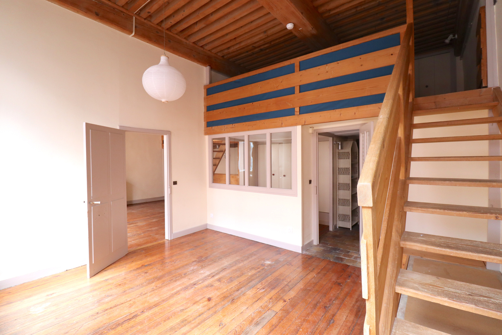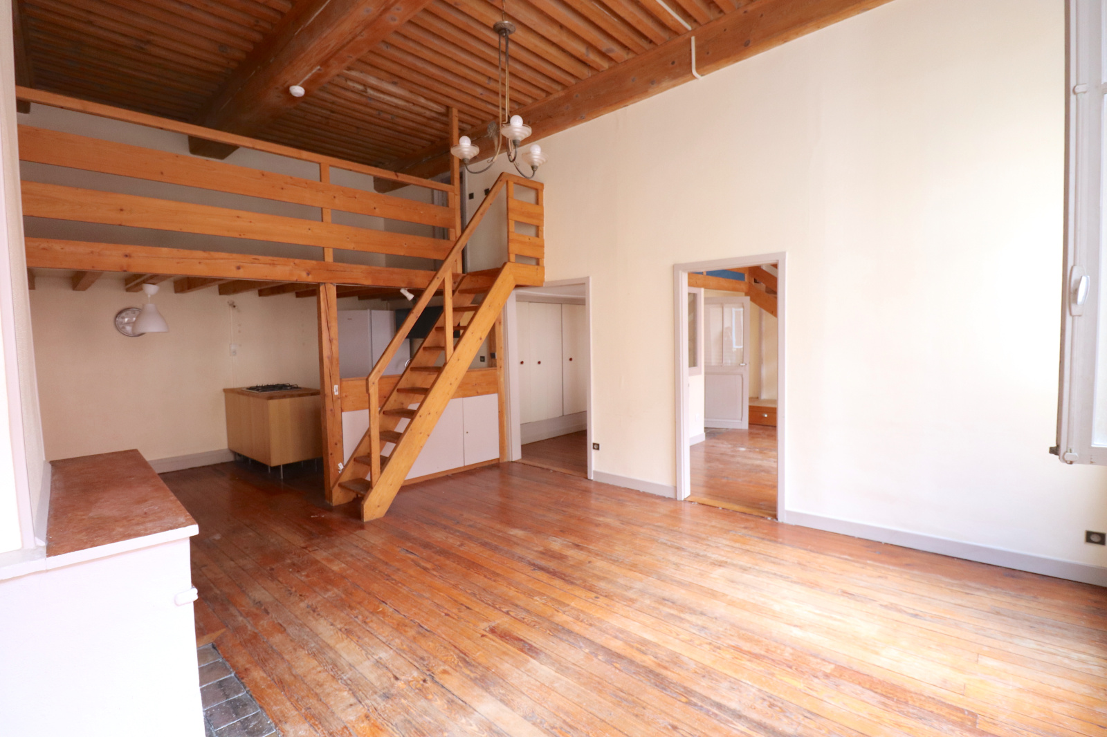 Il se compose d'une entrée avec rangements, d'un grand séjour / cuisine de 30.8m2 avec mezzanine de 10.5m2, d'une chambre de 17m2 au sol avec mezzanine de 17.9m2 (ht : 1.78)