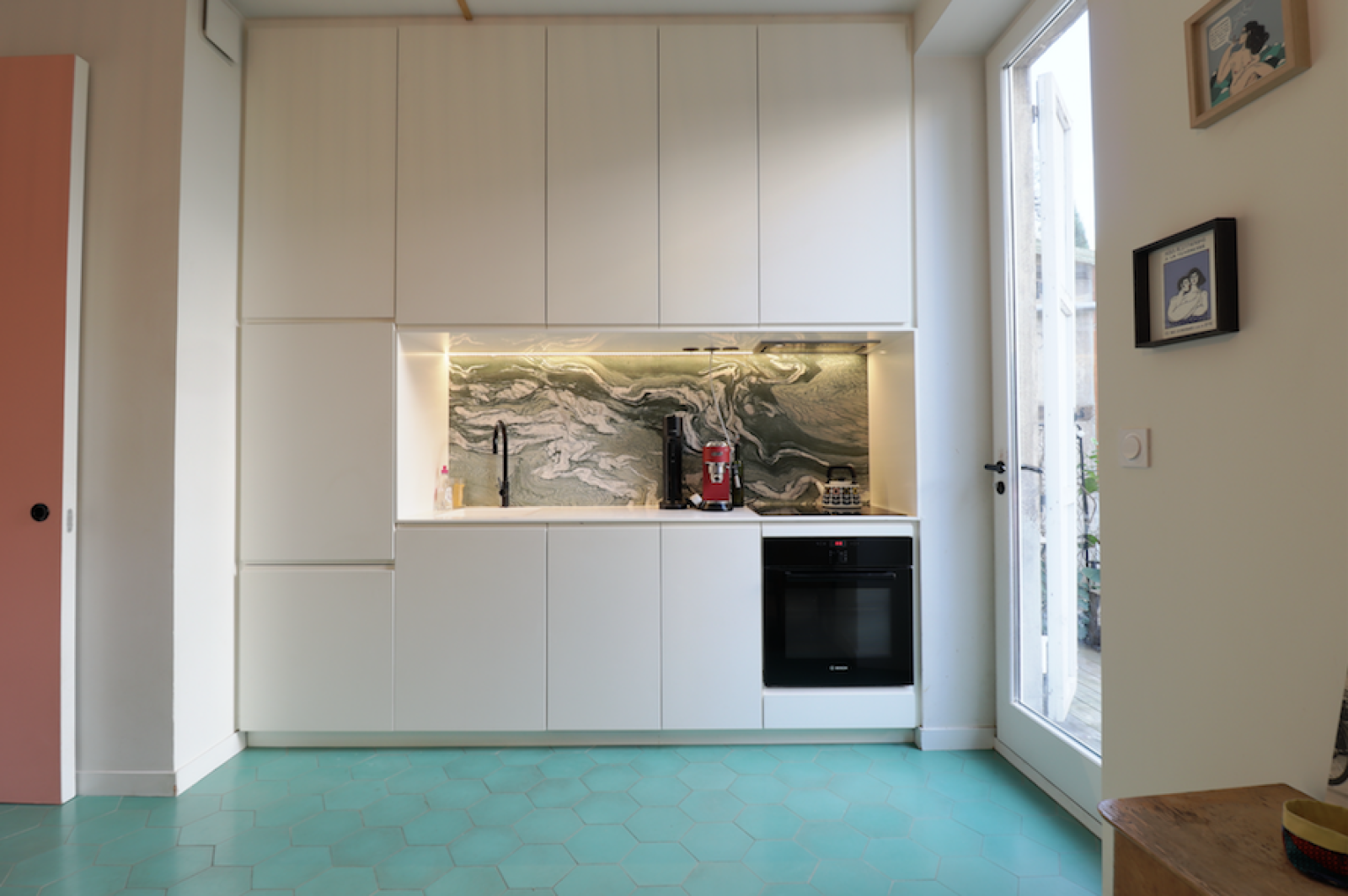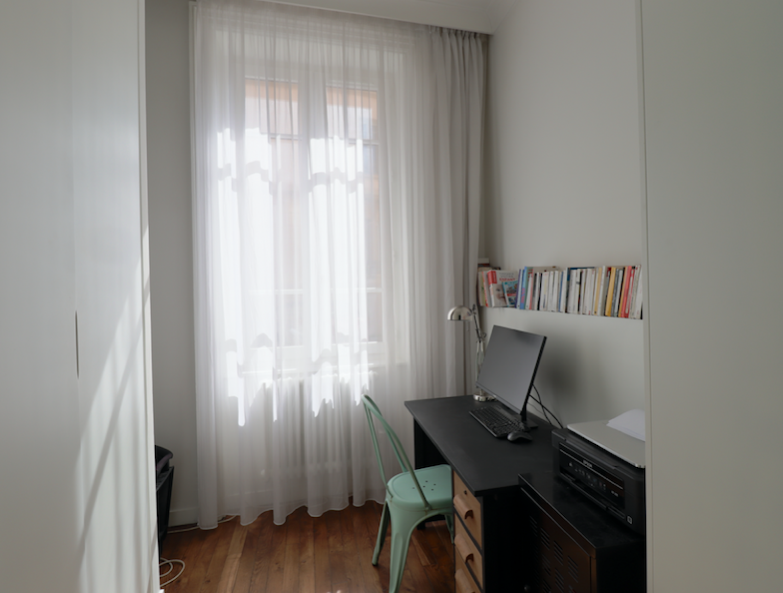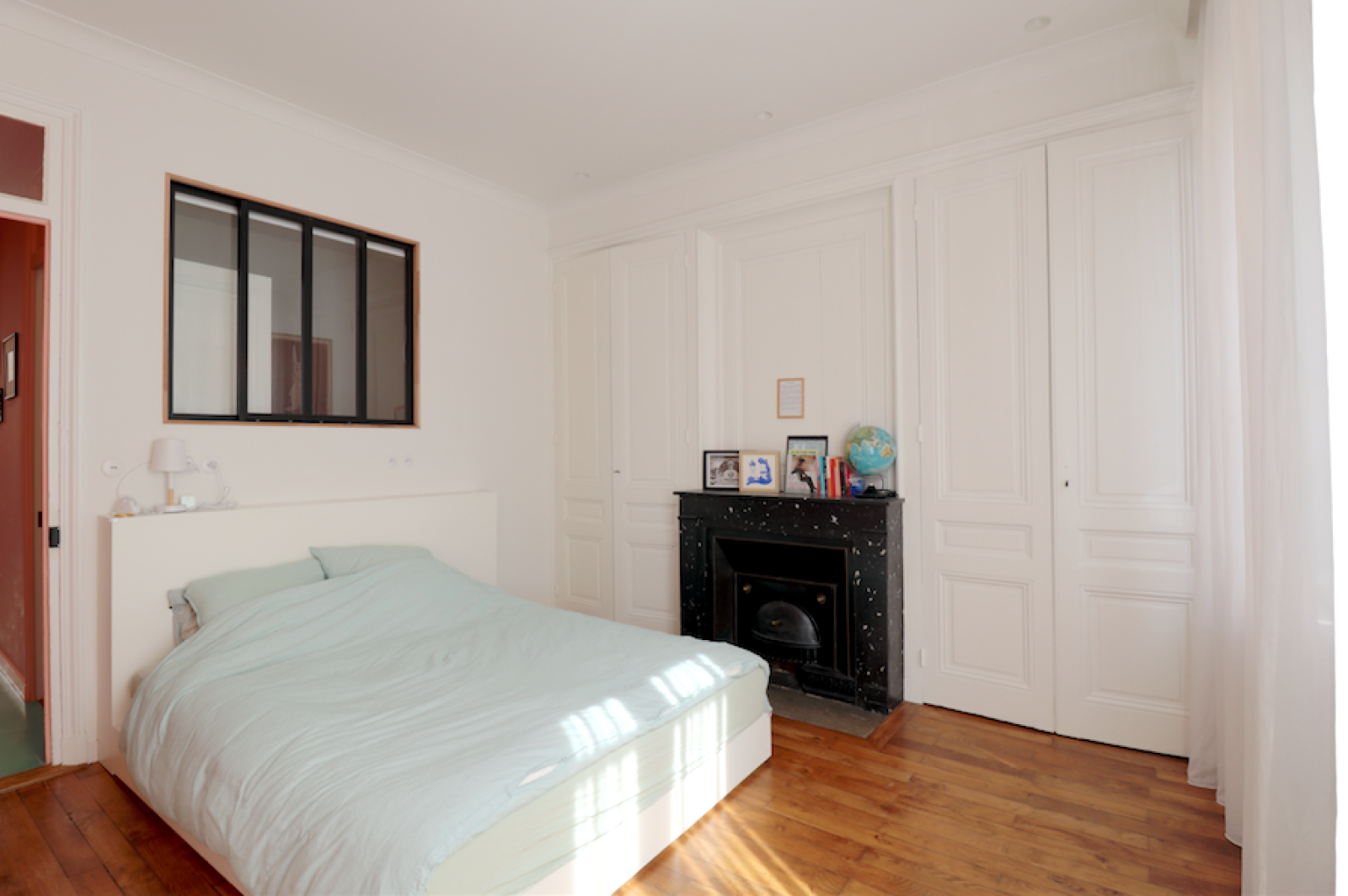 Il se compose d'une entrée avec rangements, d'un séjour en parquet avec cuisine ouverte et équipée, crédence en marbre vert et plan de travail en corian, d'une spacieuse suite parentale de 22.56 m2 en parquet avec une cheminée marbre, dressing, et salle de bains, d'une alcôve pouvant servir de chambre d'enfant avec verrière.