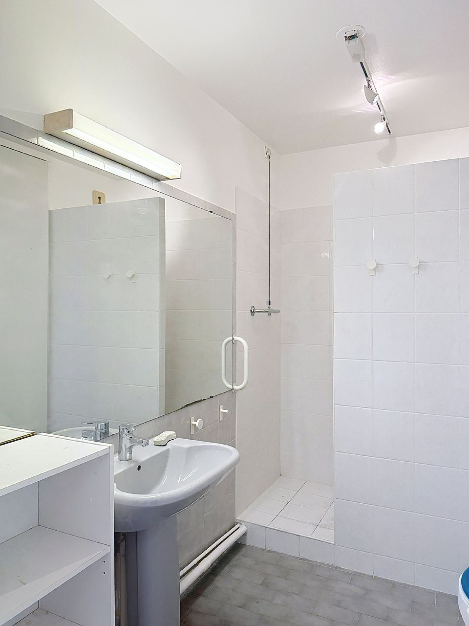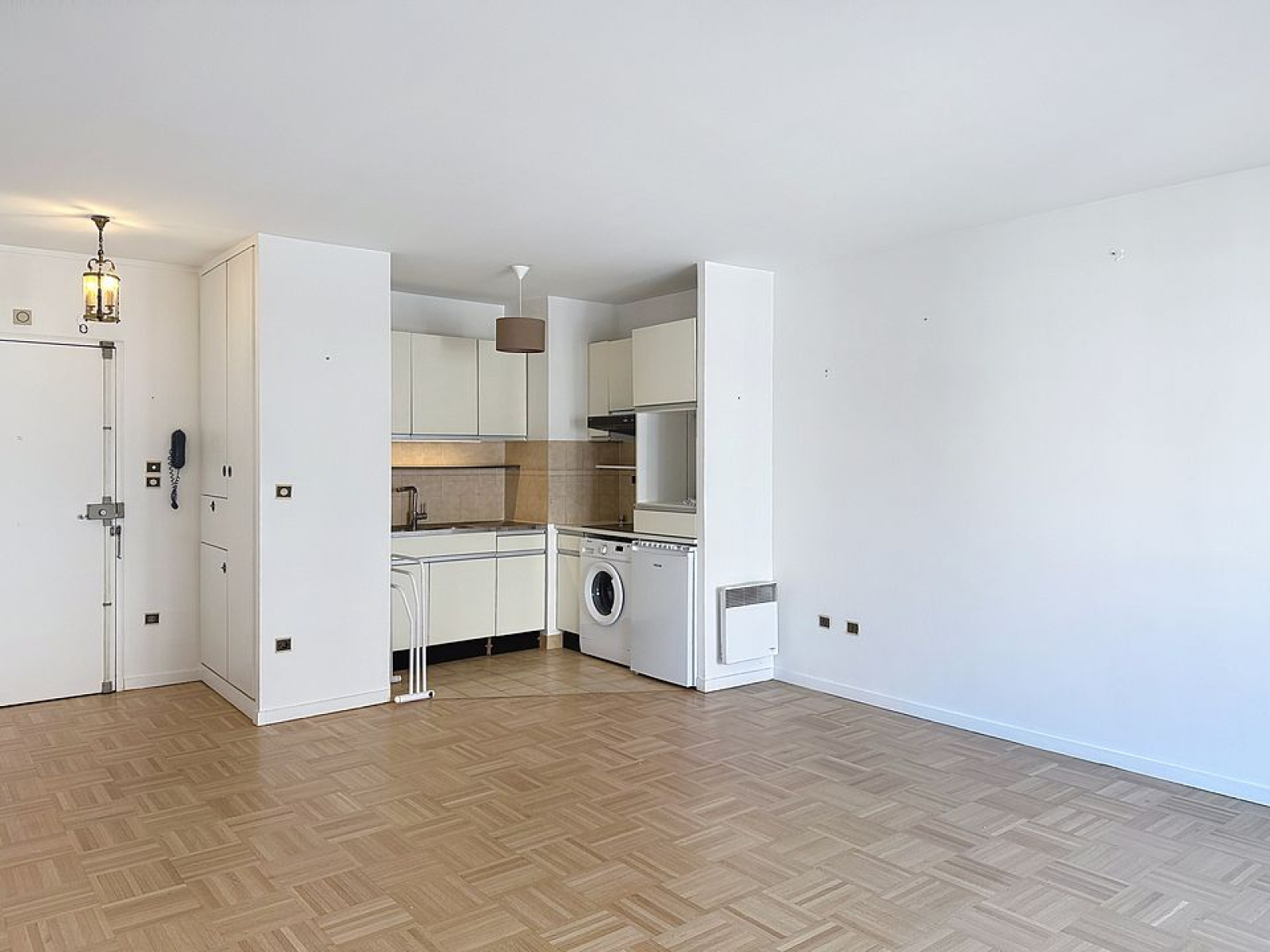 Il se compose d’une entrée avec rangements, d’un séjour en parquet, avec cuisine ouverte et entièrement équipée, ainsi que d’une chambre avec de grands placards intégrés.