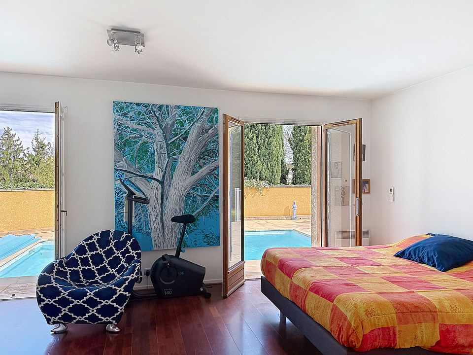 Grande terrasse plein Sud avec piscine 7 x 3,5 m au sel , vue dégagée et arborée.