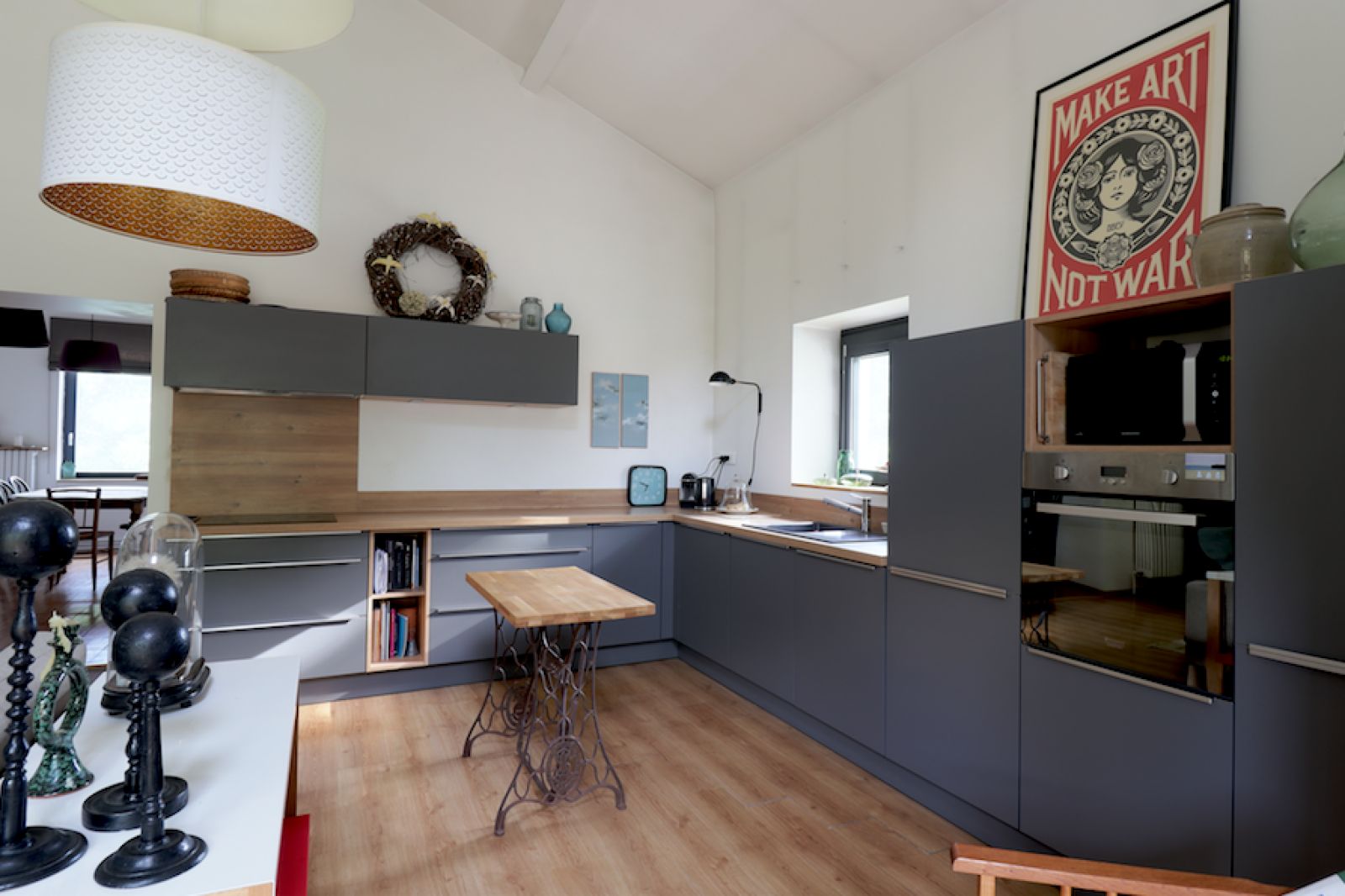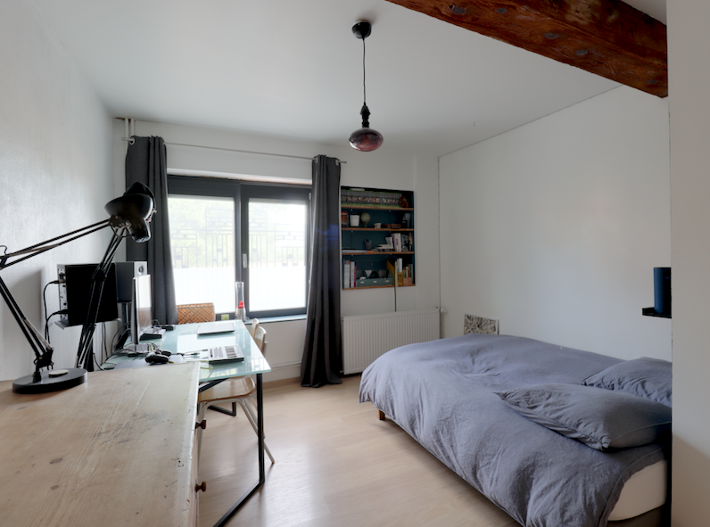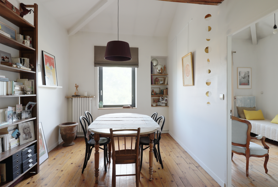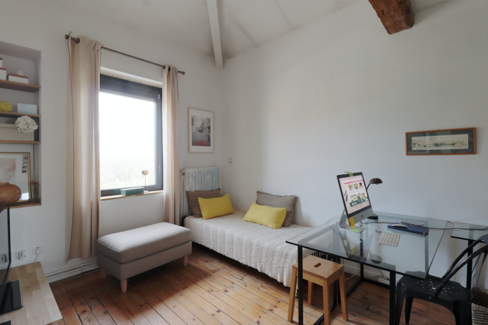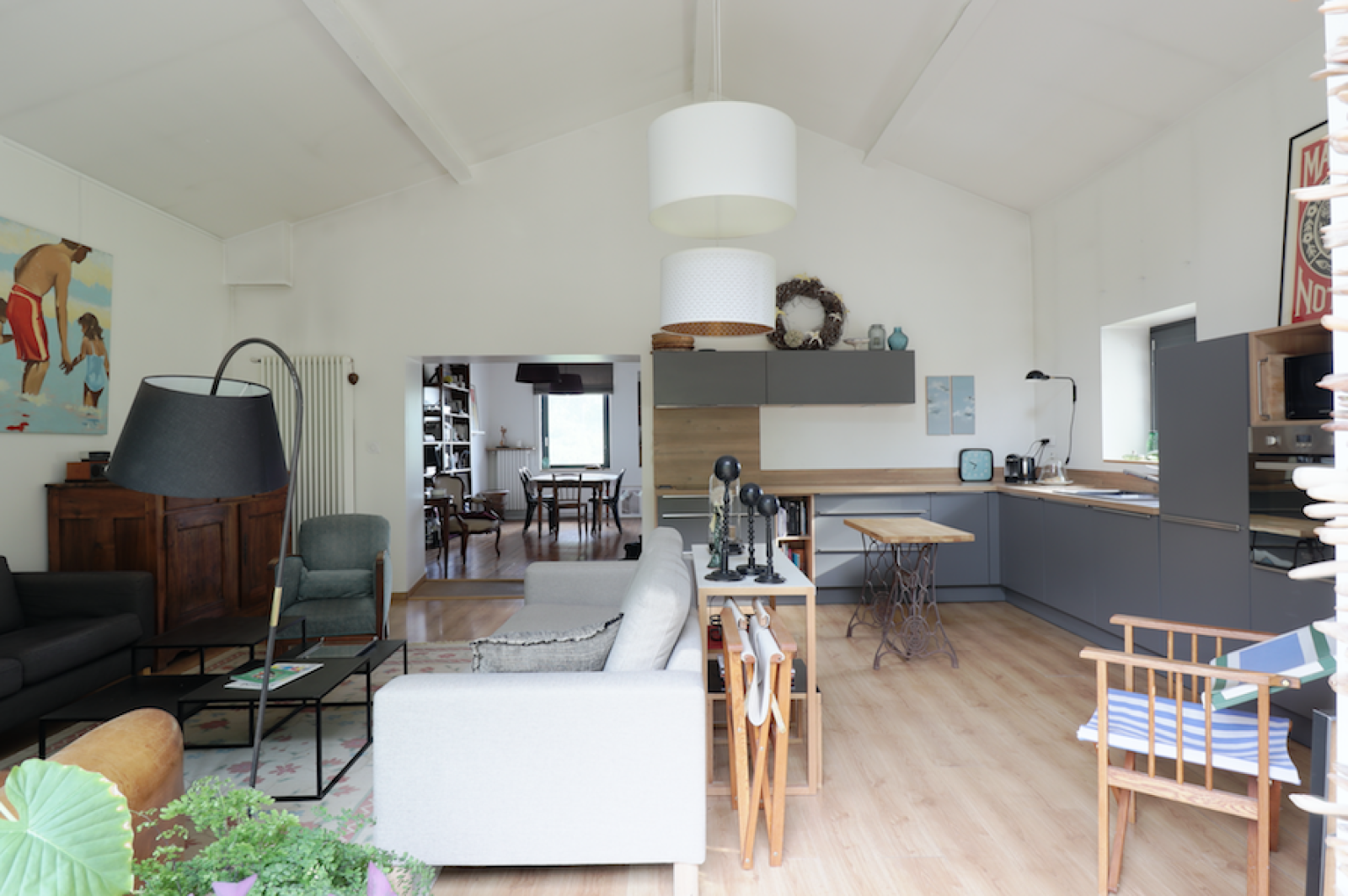 A l'étage donnant sur jardin plein de charme arboré et fleuri, avec une terrasse carrelée, un grand séjour avec très belle hauteur sous plafond, poële à bois créant une belle ambiance conviviale (et économique!)