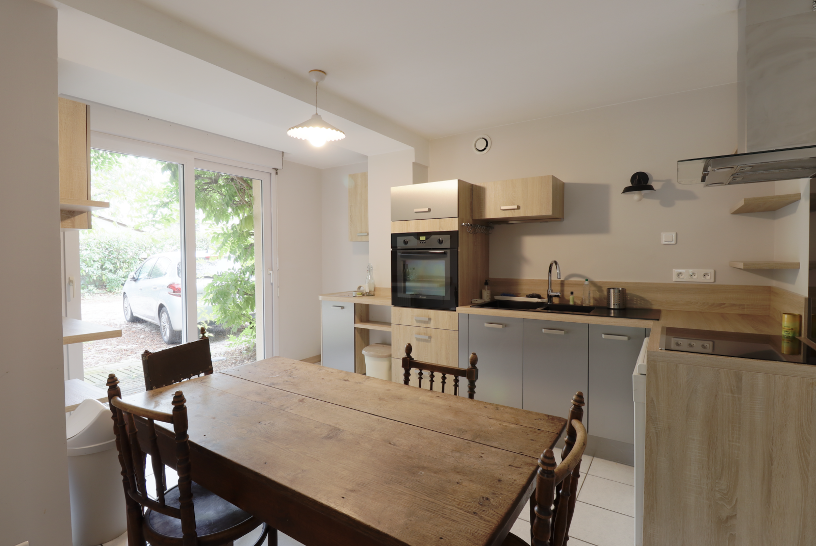 Elle se compose au rez de chaussée d'un séjour et d'une cuisine équipée ouvrant tous 2 sur le jardin, d'une salle de bains, wc indépendant, d'un cellier ainsi qu' un garage fermé faisant office d'atelier/rangement/chaufferie.